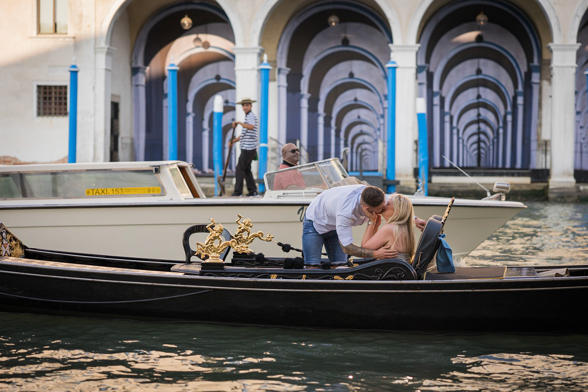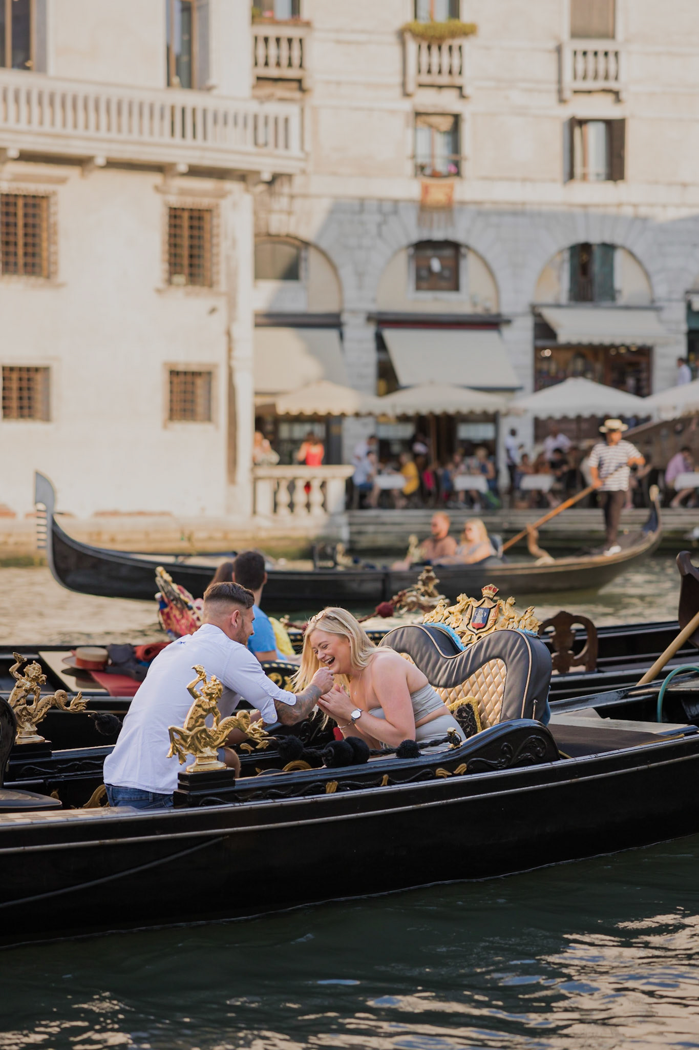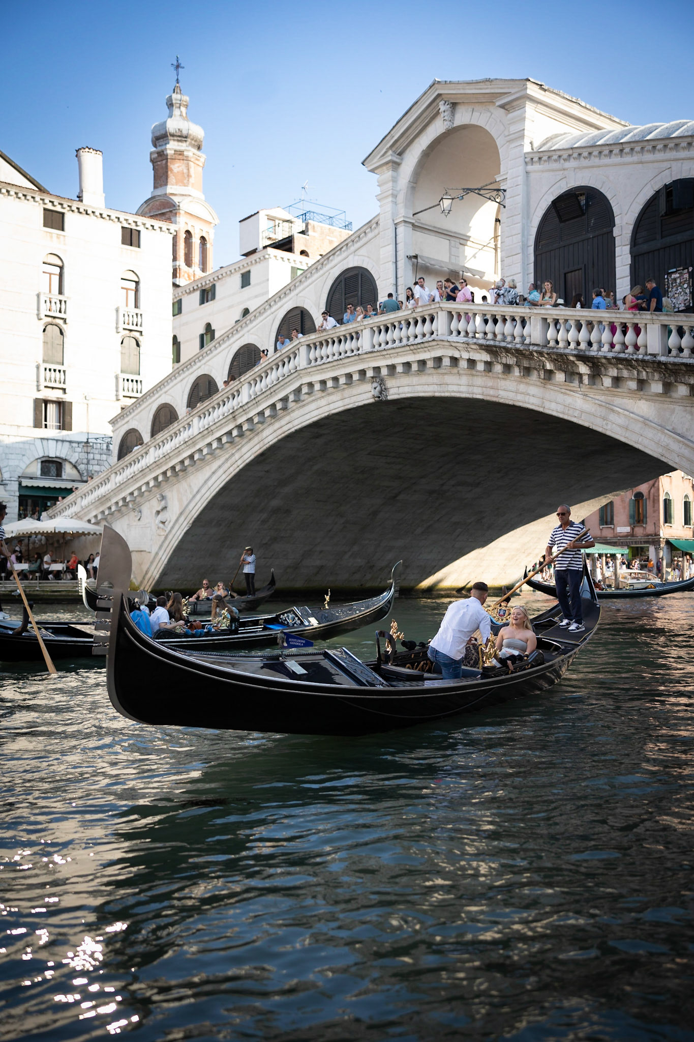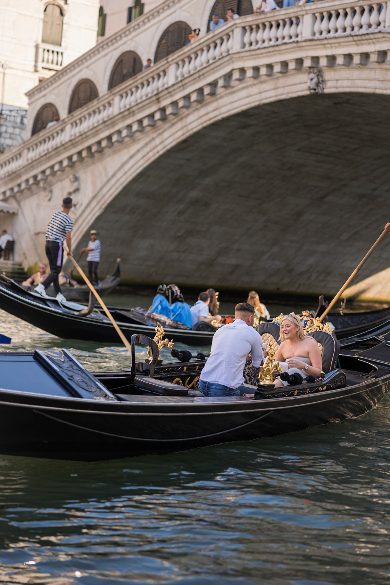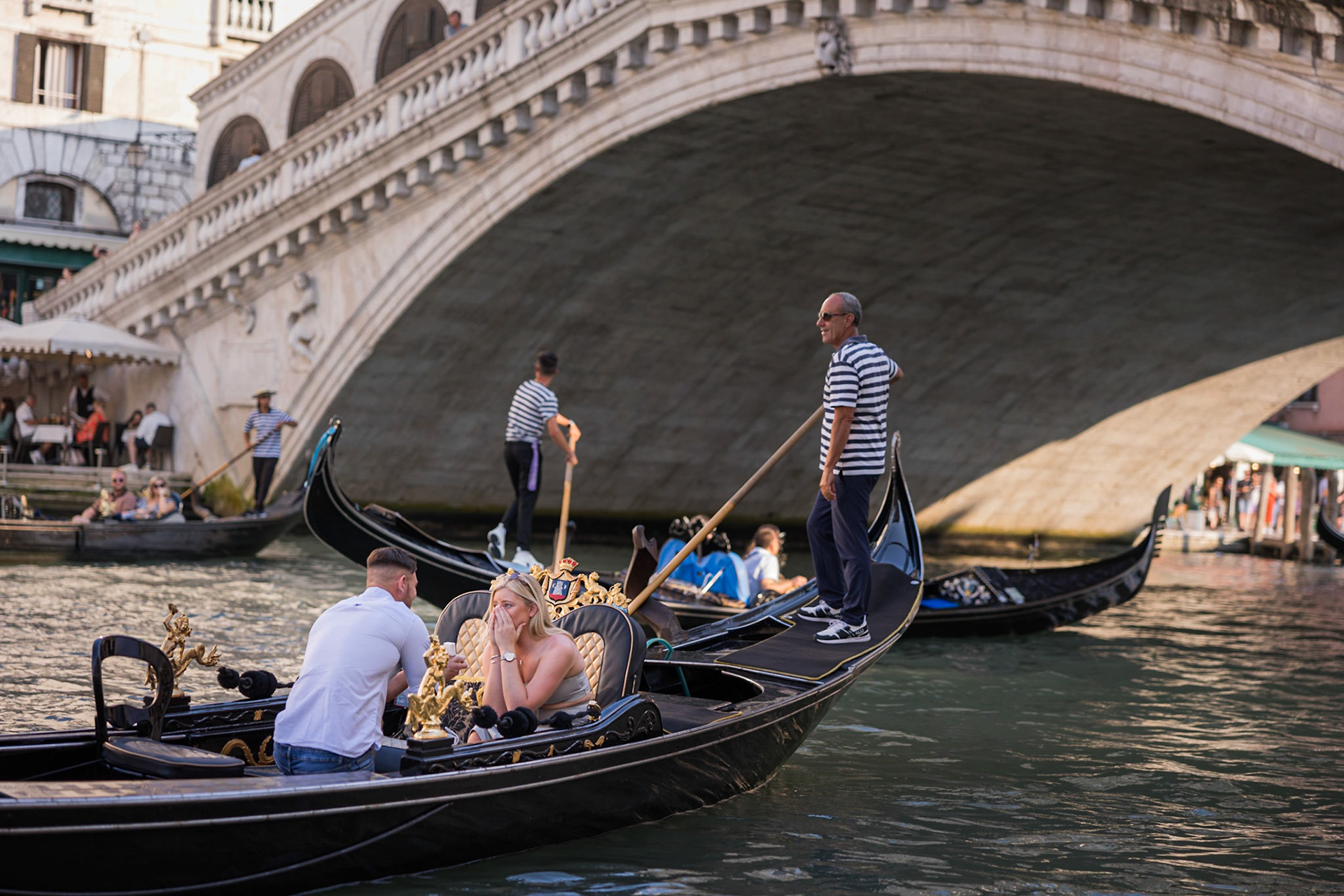 Surprise marriage proposals on a gondola while exploring grand canal and right after passing Rialto Bridge. Then an engagement session in Venice, a cocktail at Al Mercante and back to the hotel Papadopoli.
