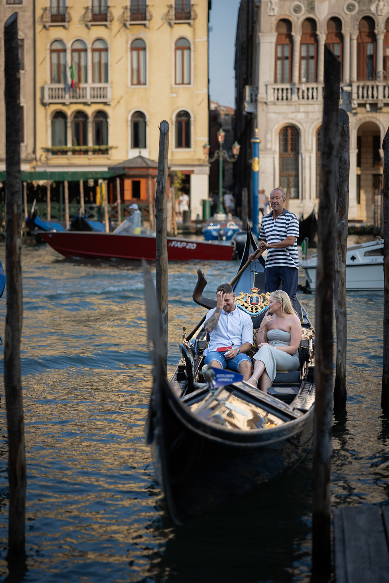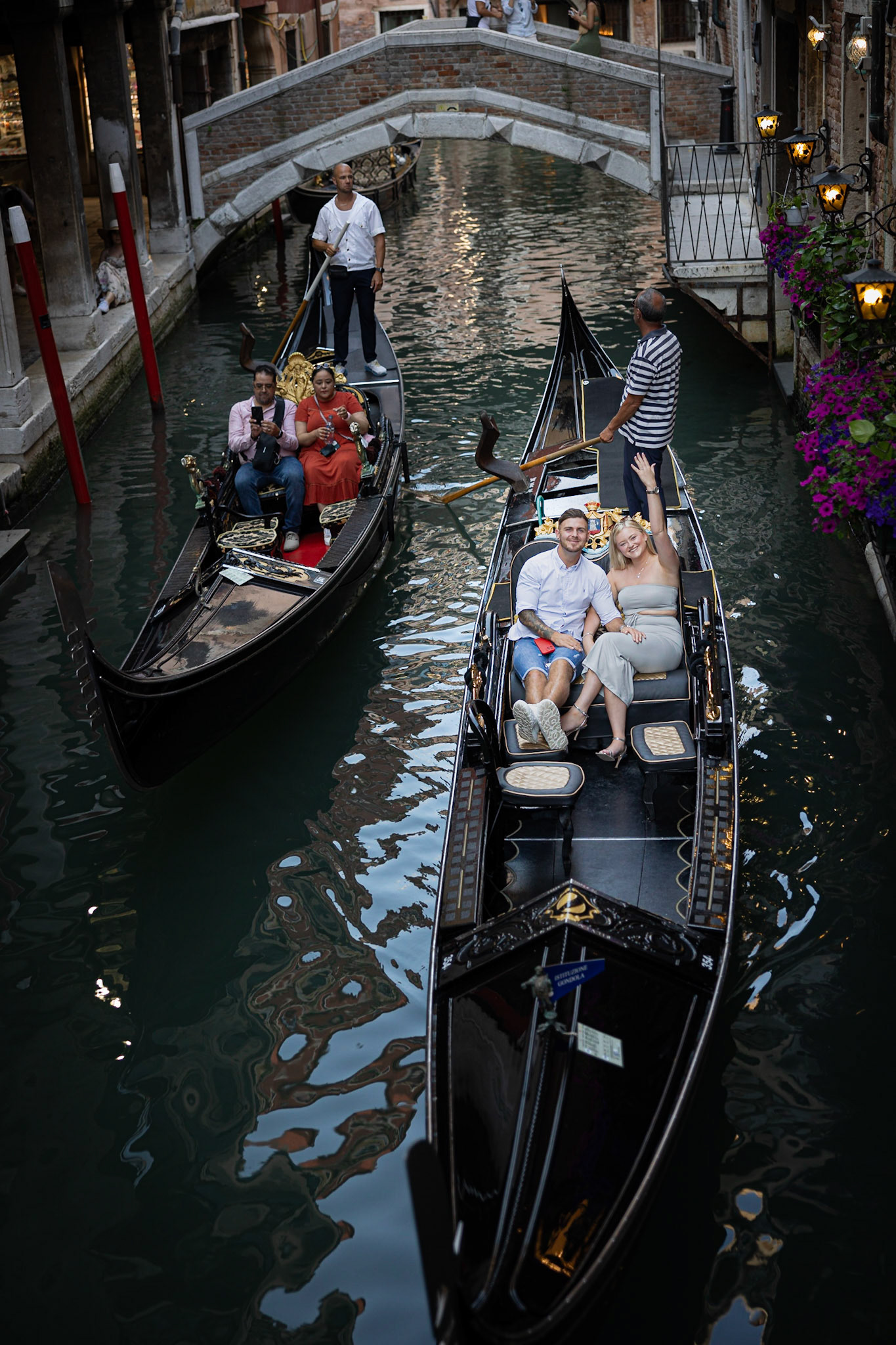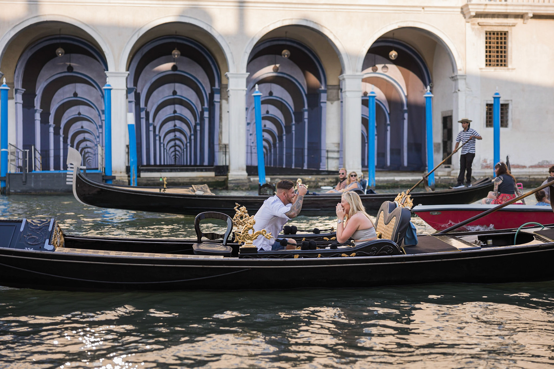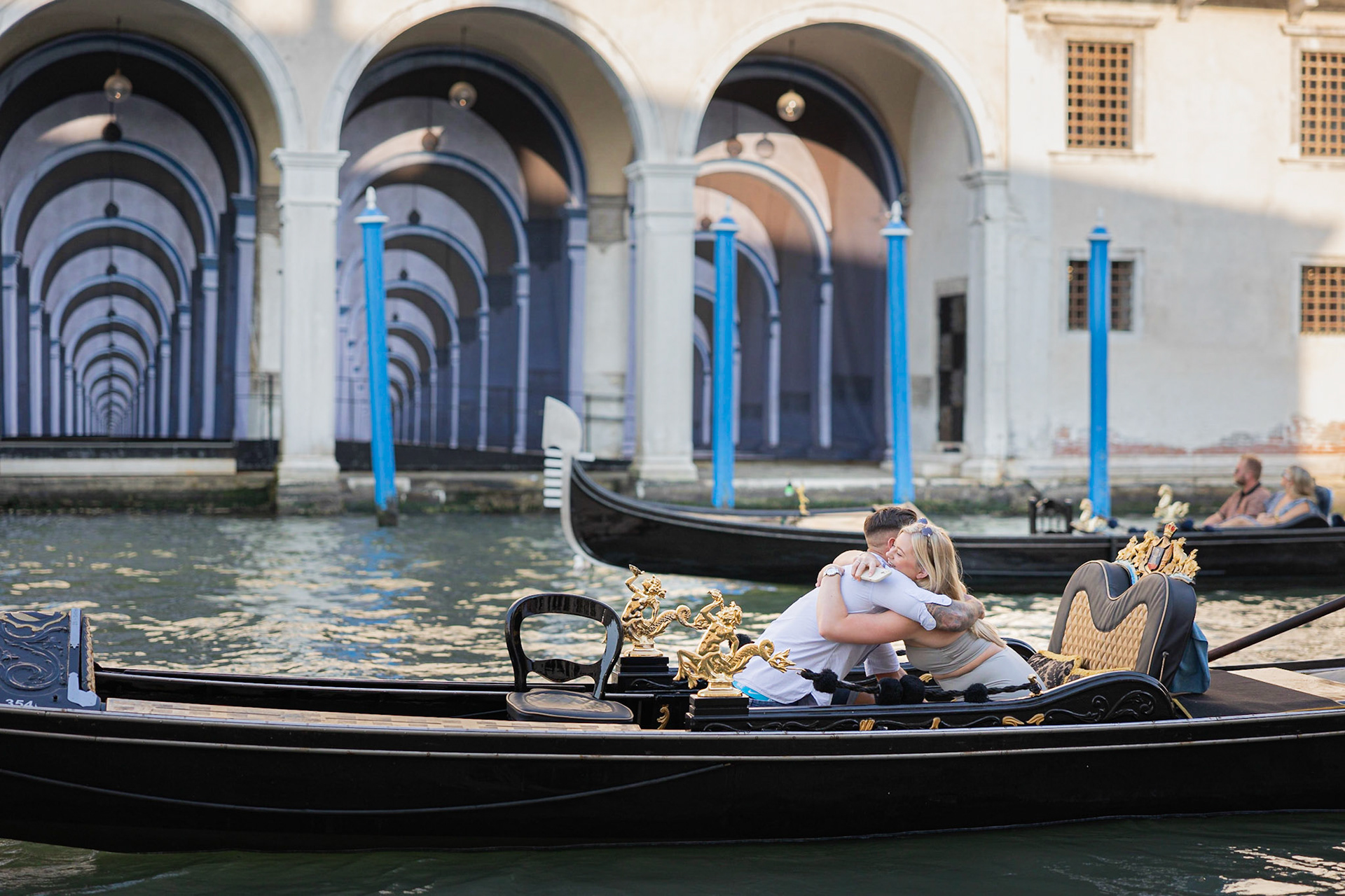Surprise marriage proposals on a gondola while exploring grand canal and right after passing Rialto Bridge. Then an engagement session in Venice, a cocktail at Al Mercante and back to the hotel Papadopoli.