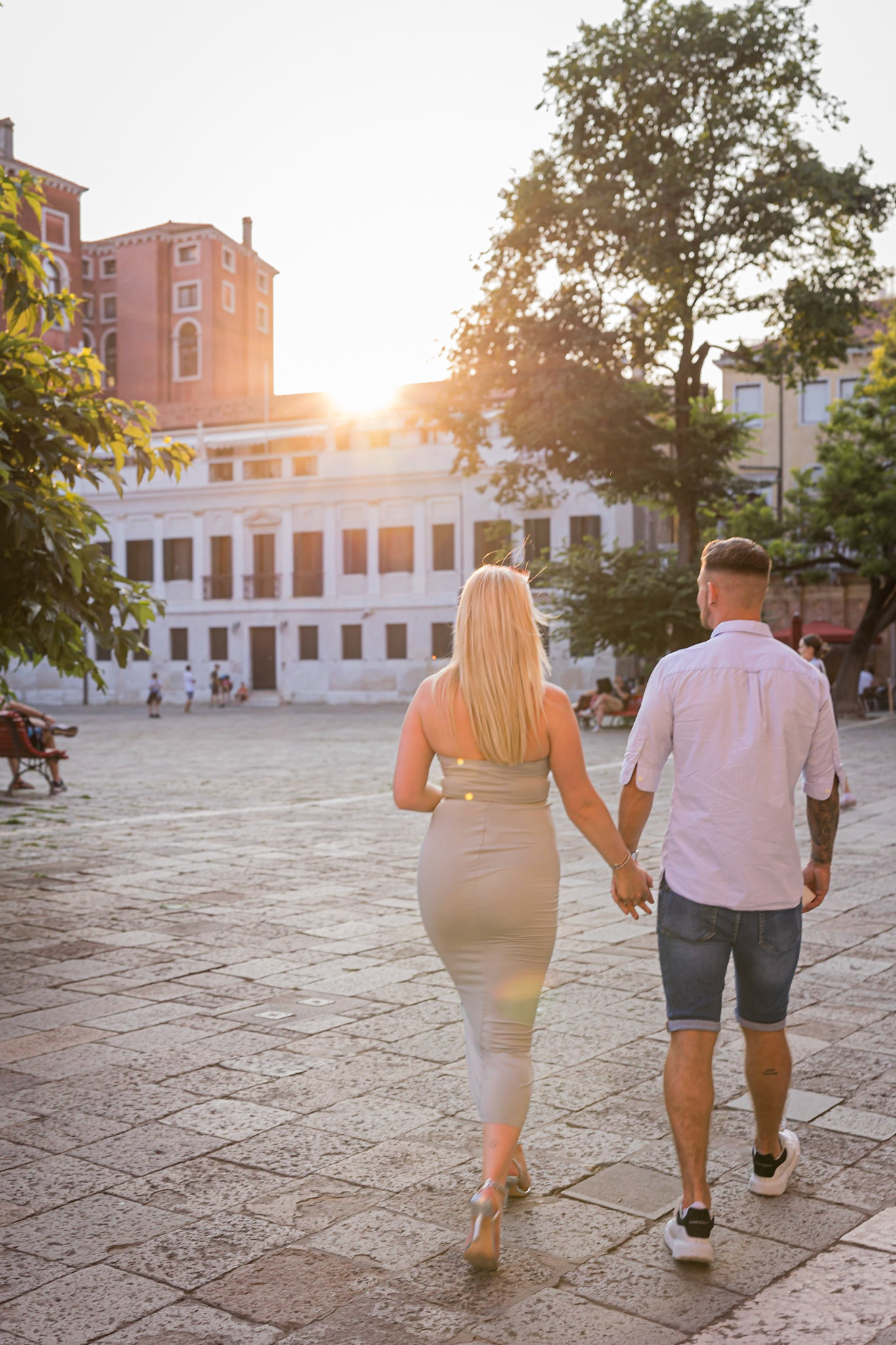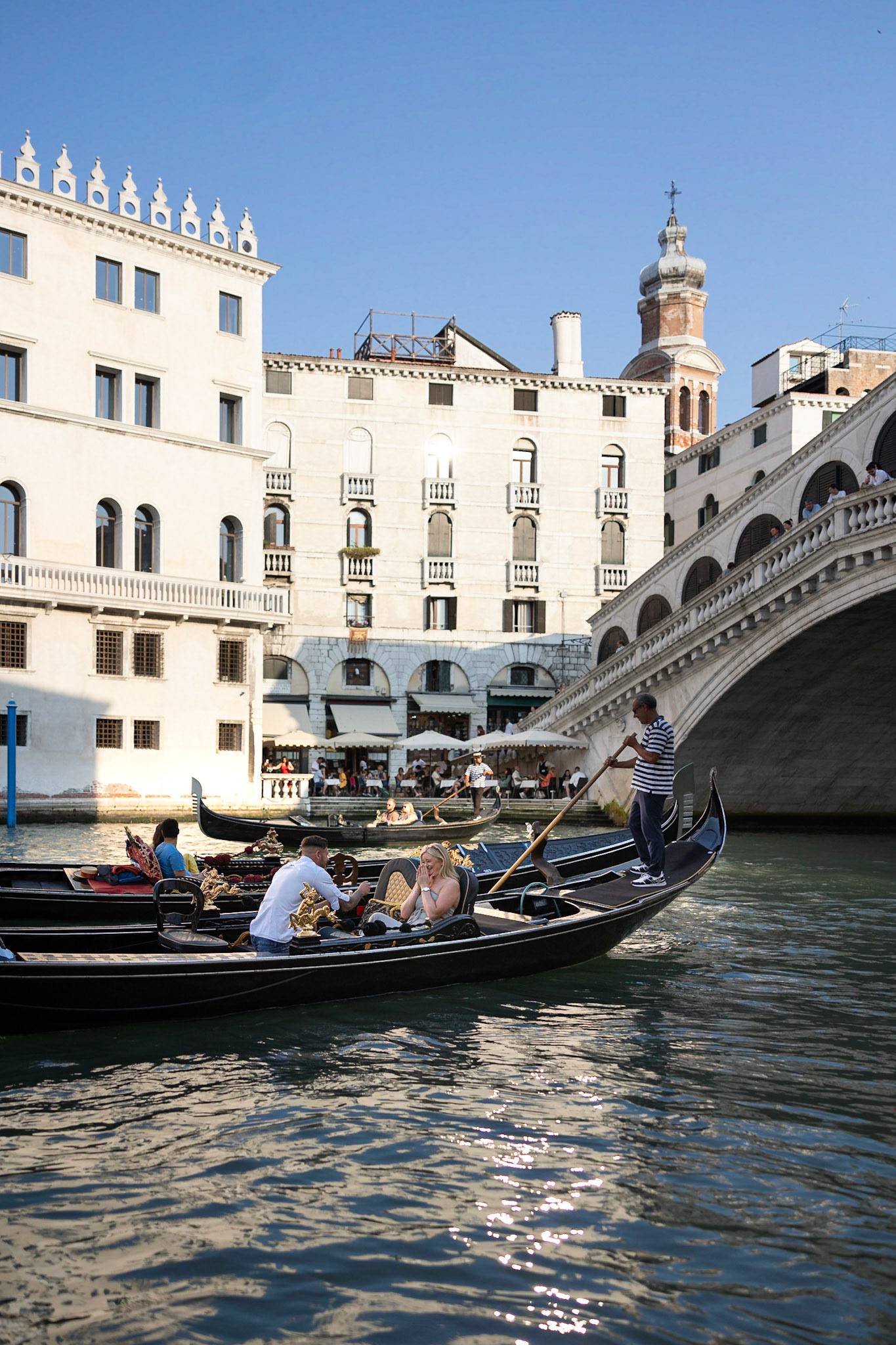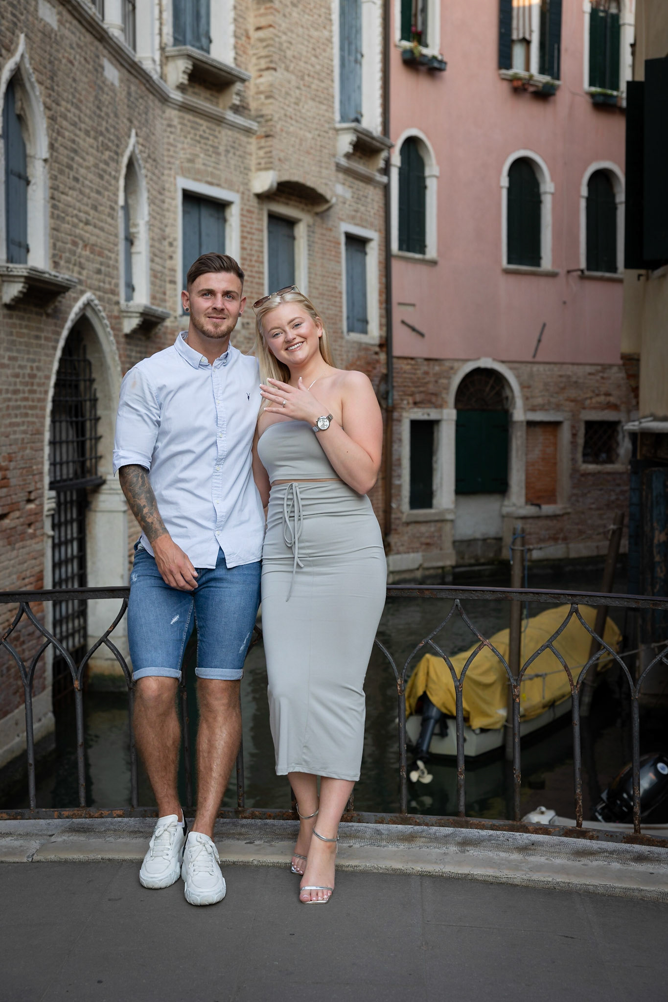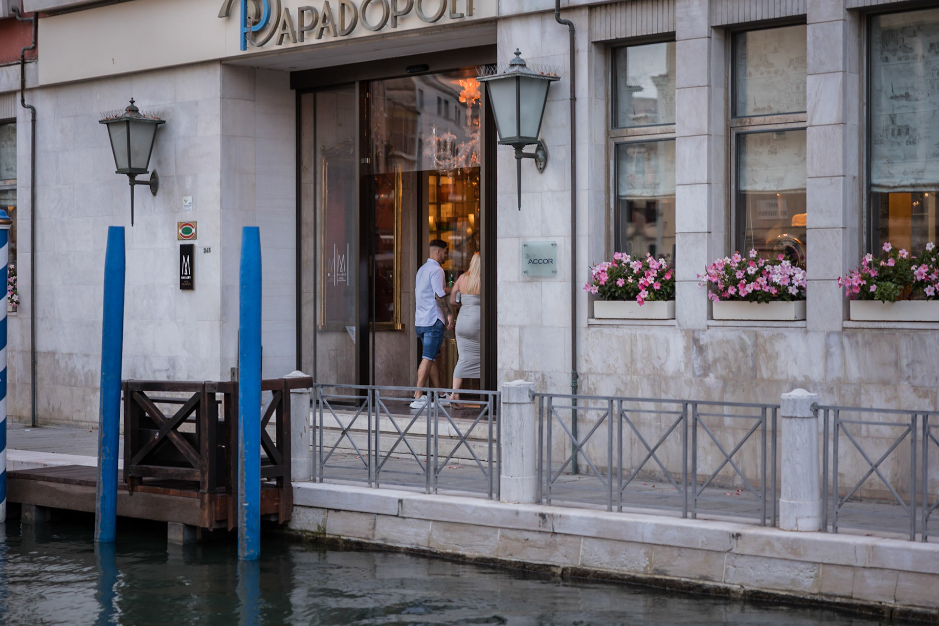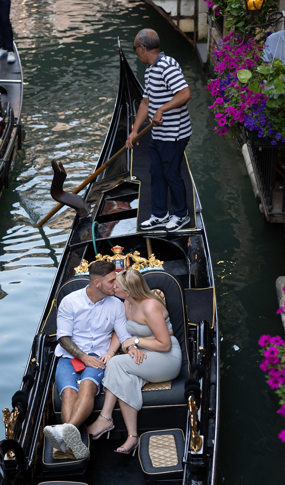 Surprise marriage proposals on a gondola while exploring grand canal and right after passing Rialto Bridge. Then an engagement session in Venice, a cocktail at Al Mercante and back to the hotel Papadopoli.