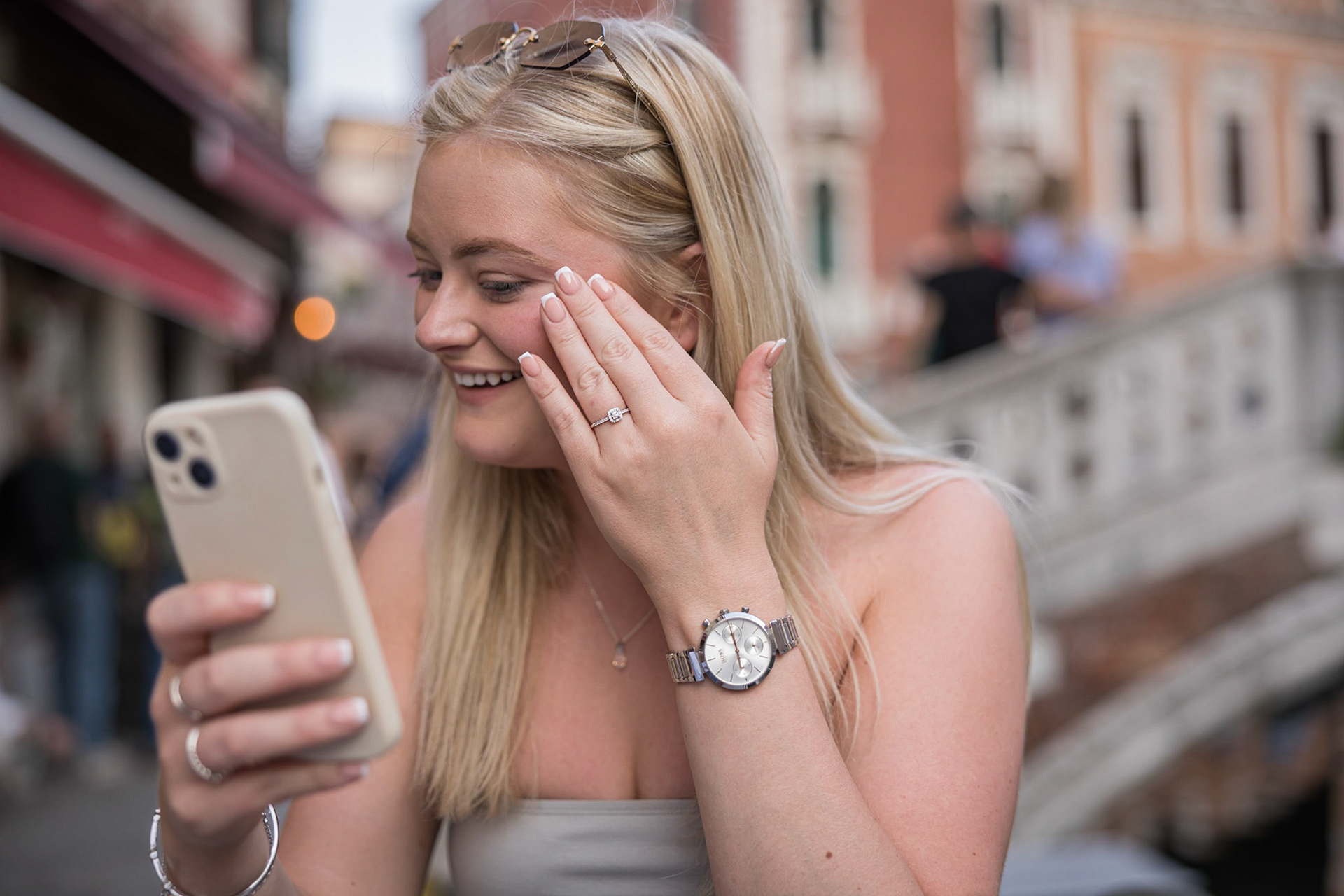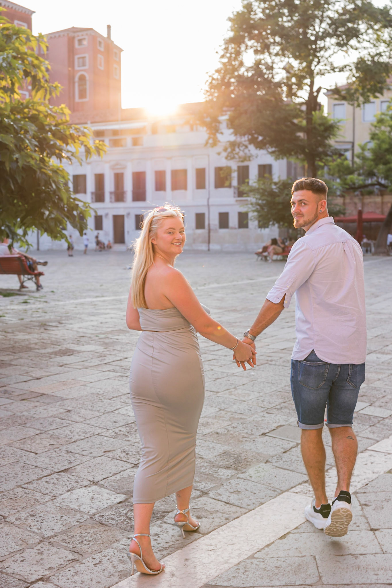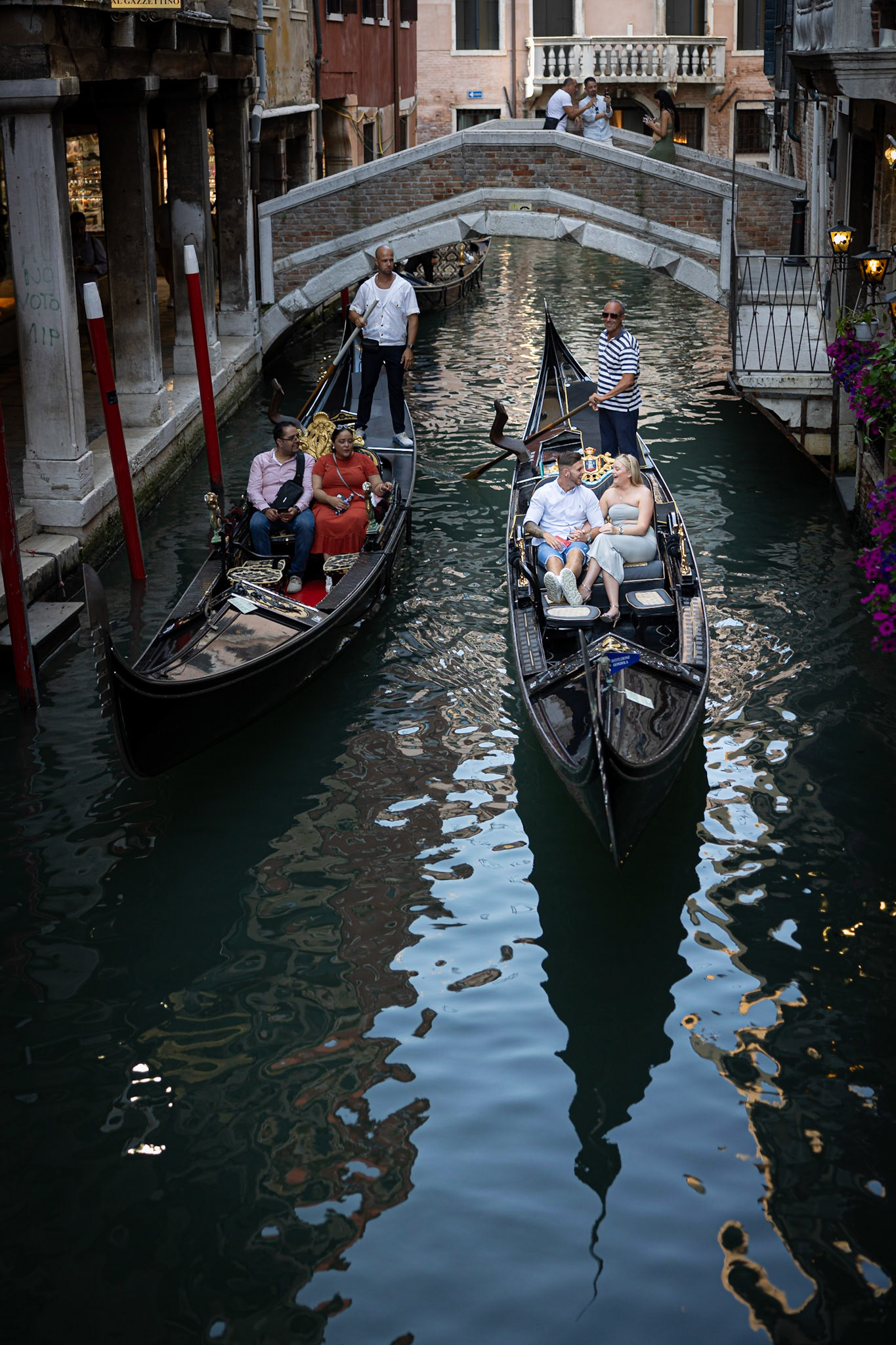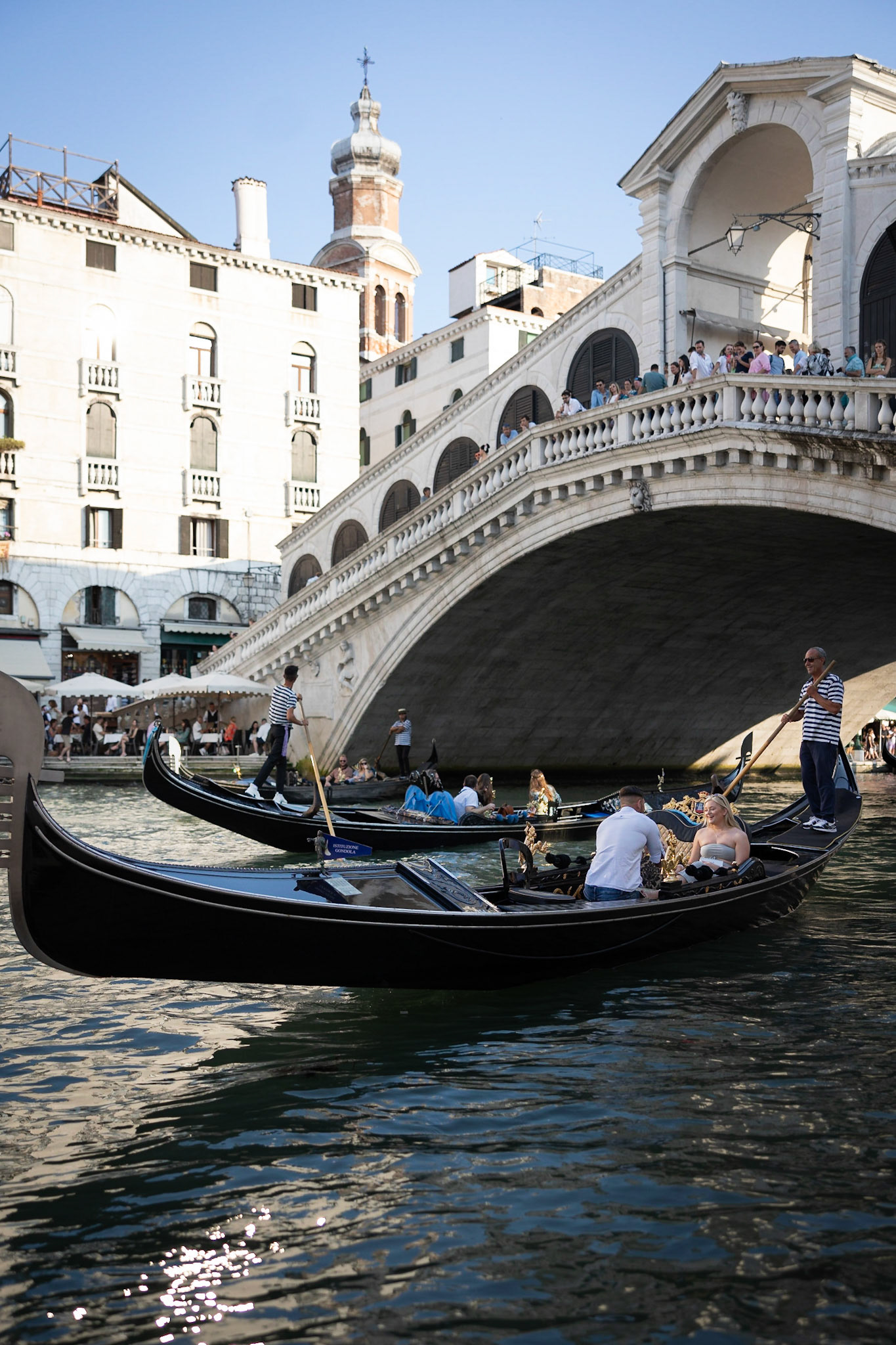 Surprise marriage proposals on a gondola while exploring grand canal and right after passing Rialto Bridge. Then an engagement session in Venice, a cocktail at Al Mercante and back to the hotel Papadopoli.