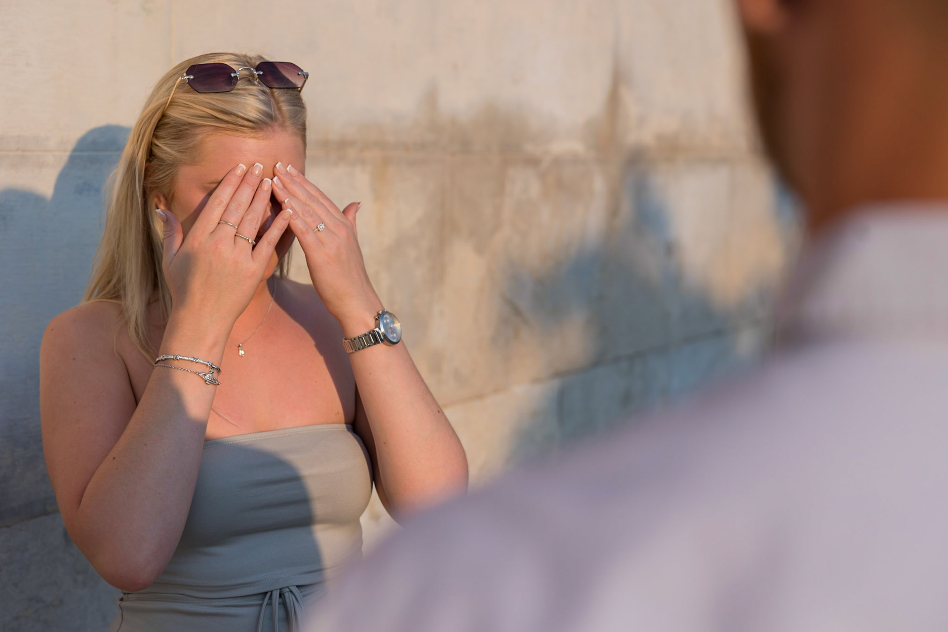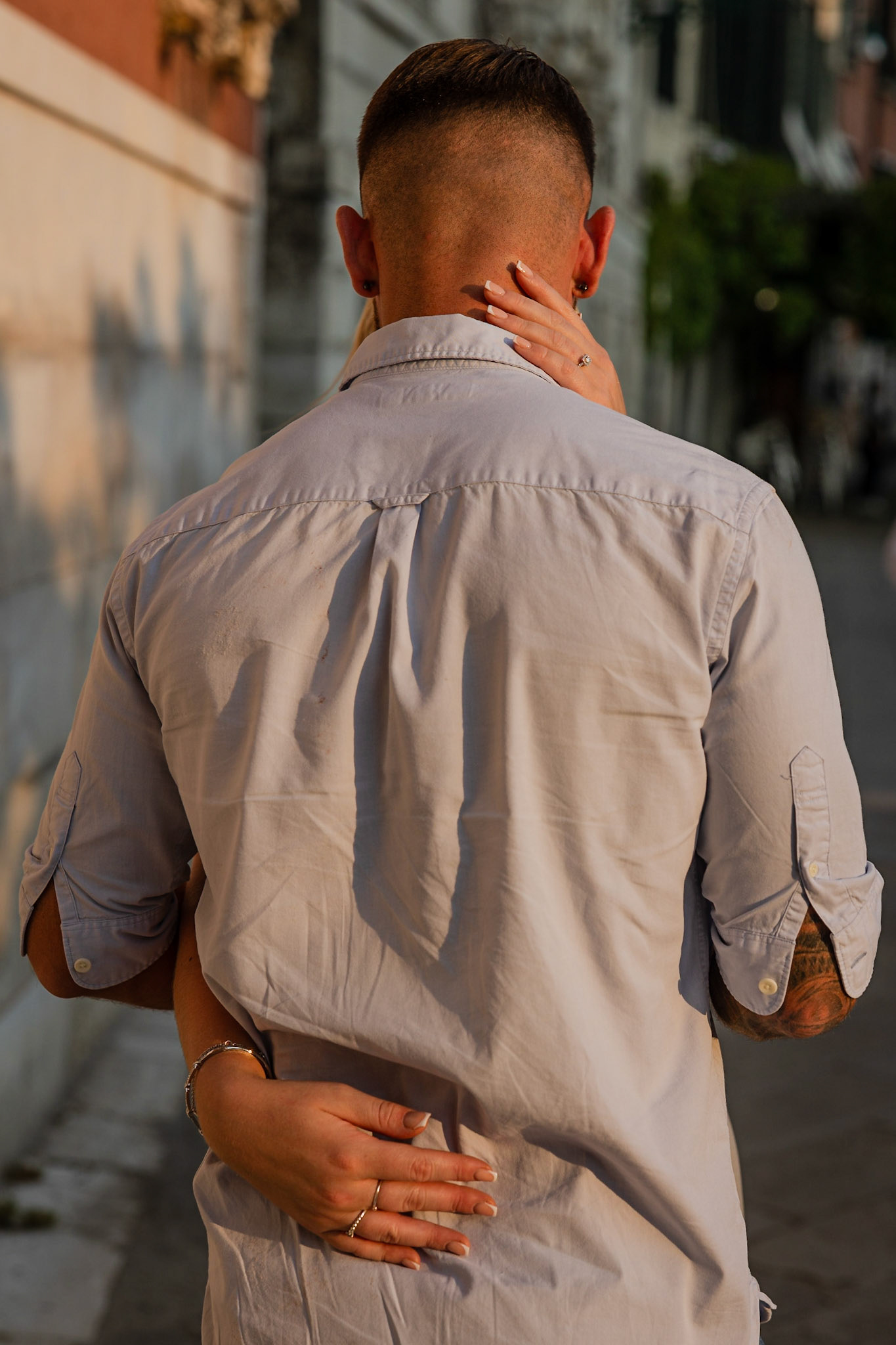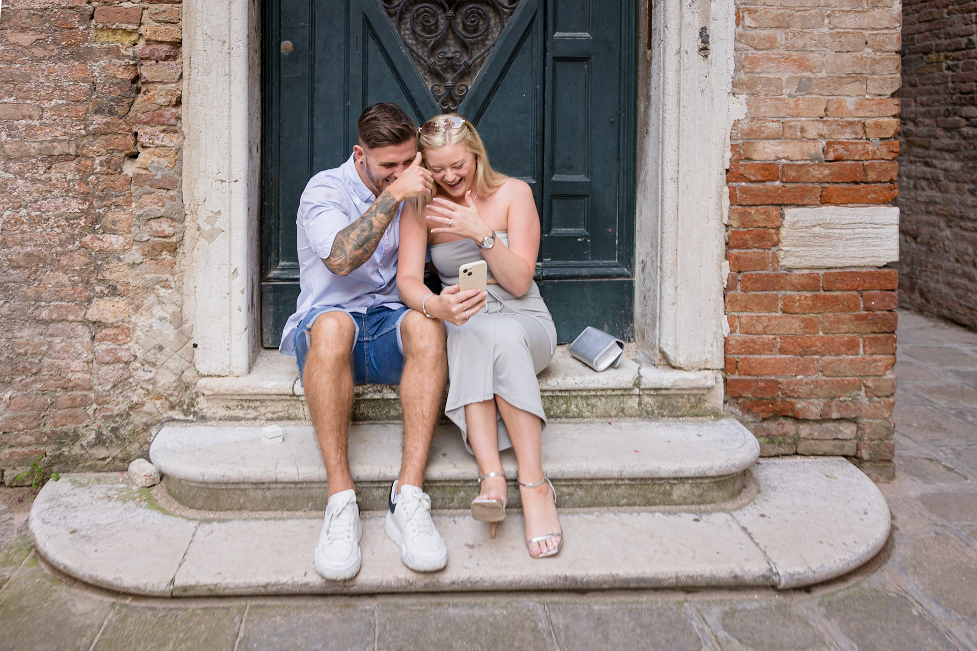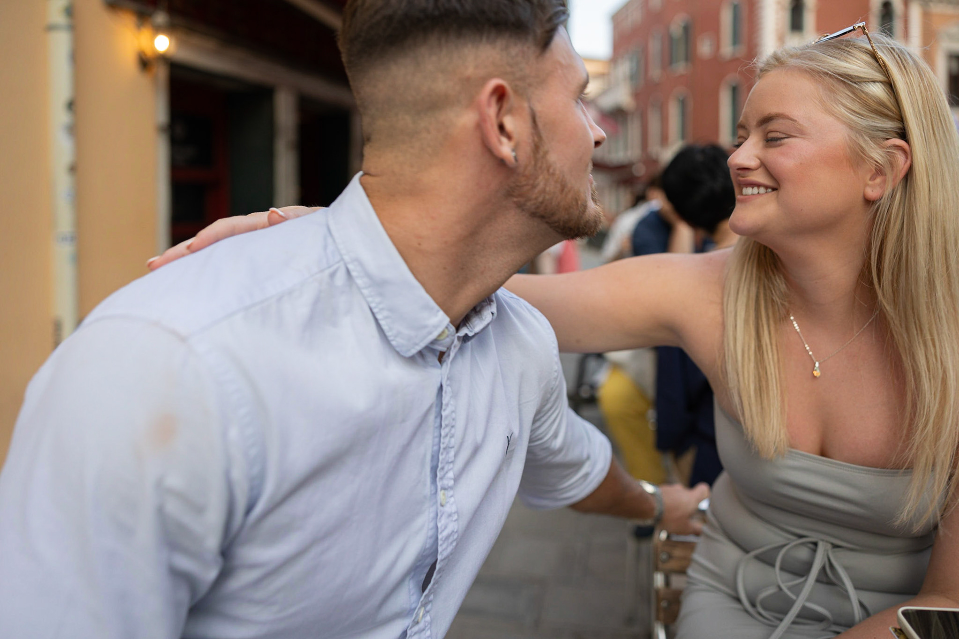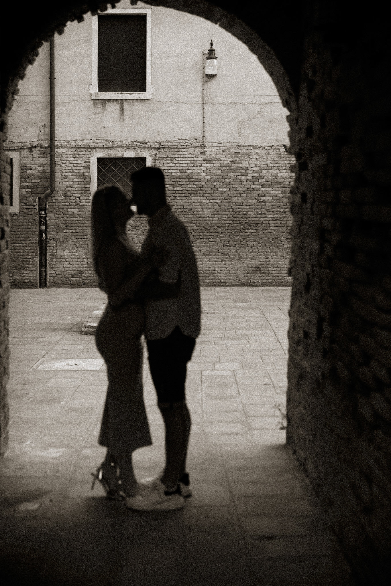 Surprise marriage proposals on a gondola while exploring grand canal and right after passing Rialto Bridge. Then an engagement session in Venice, a cocktail at Al Mercante and back to the hotel Papadopoli.