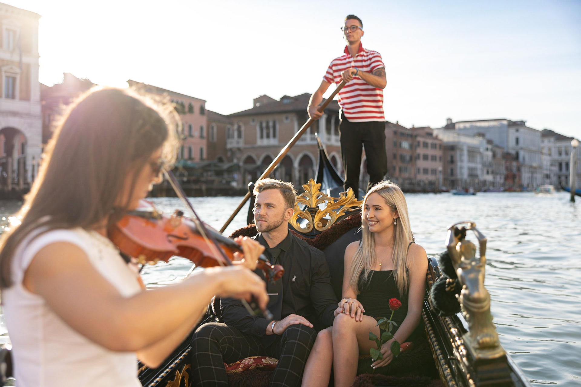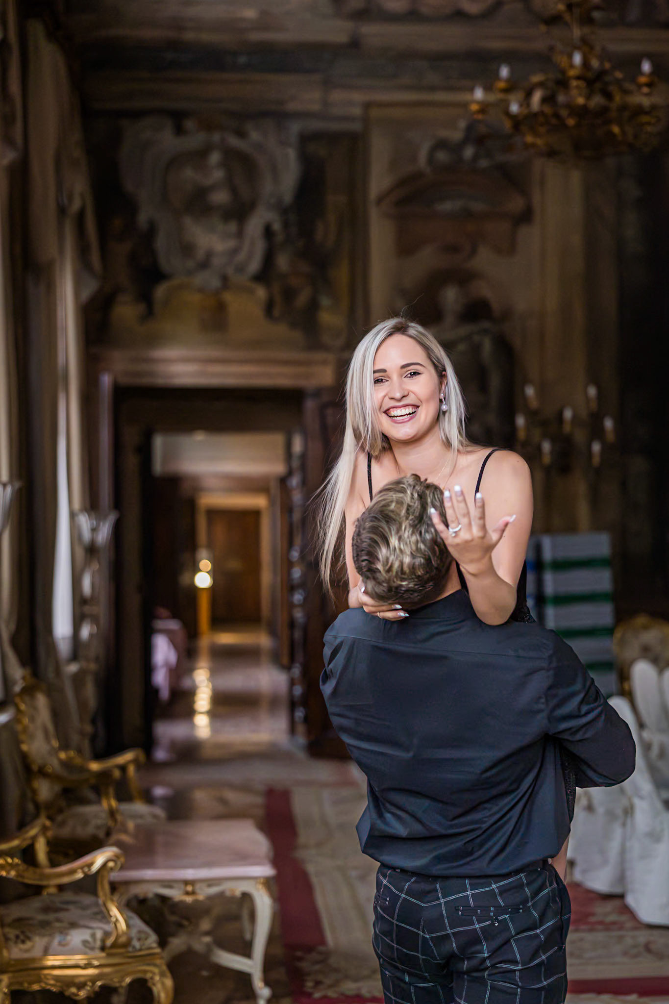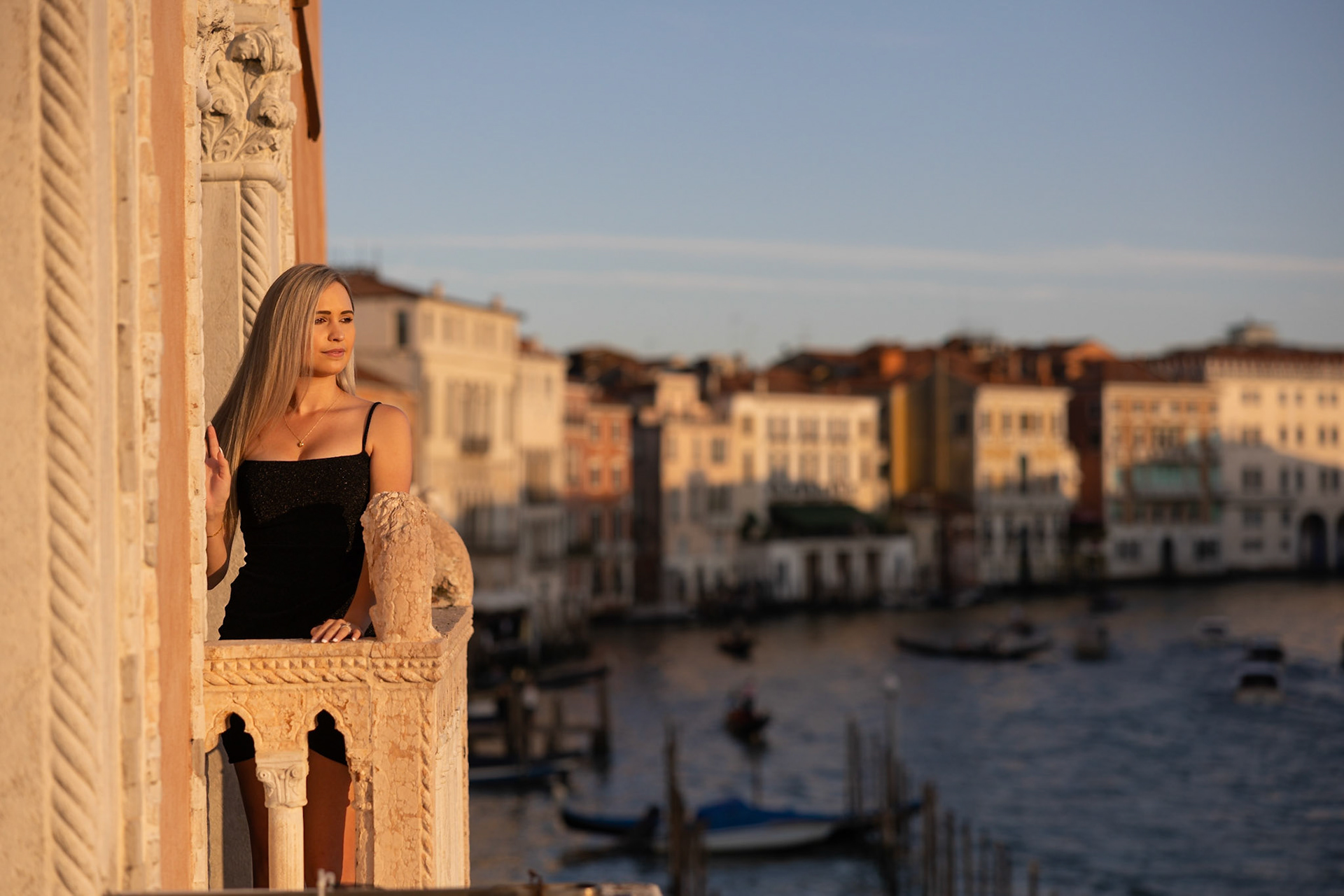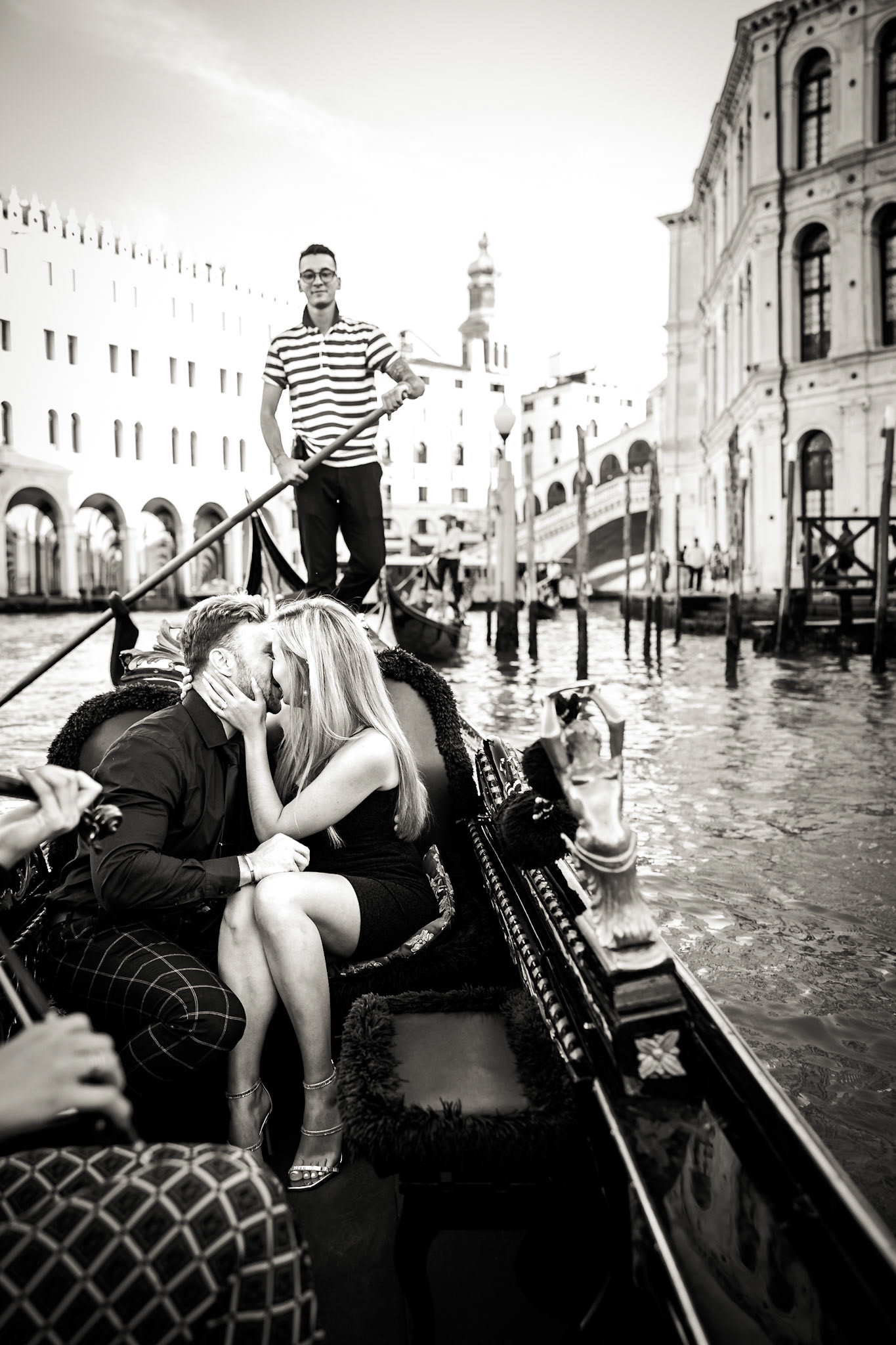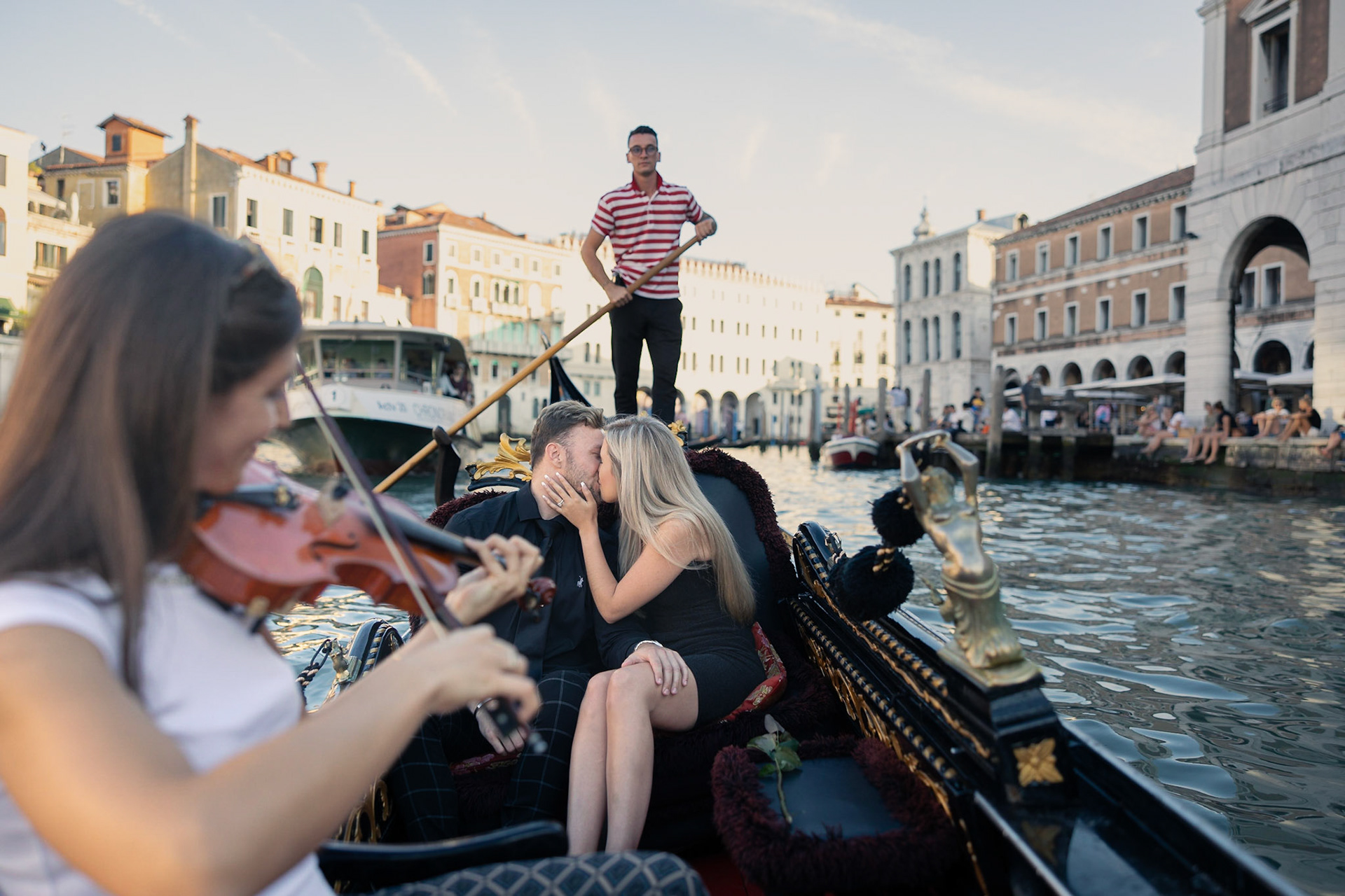 It started as a gondola tour on Grand Canal in Venice. The presence of a violinist hinted that it was a special occasion, soon after departure we crossed Rialto bridge and the proposal has been made. Once back to hotel Ca' Sagredo a short but intense engagement session with sunset light and we ended the photosession with a walk in Venice.