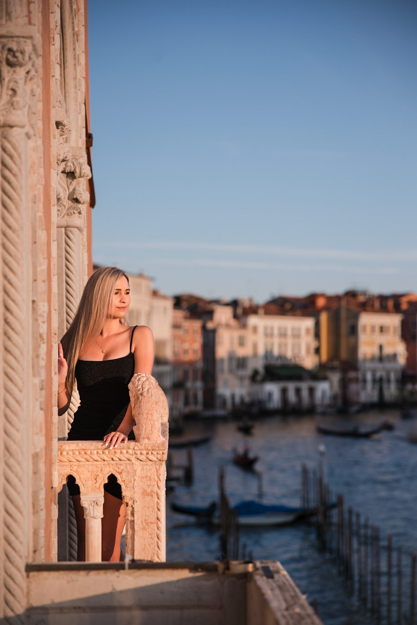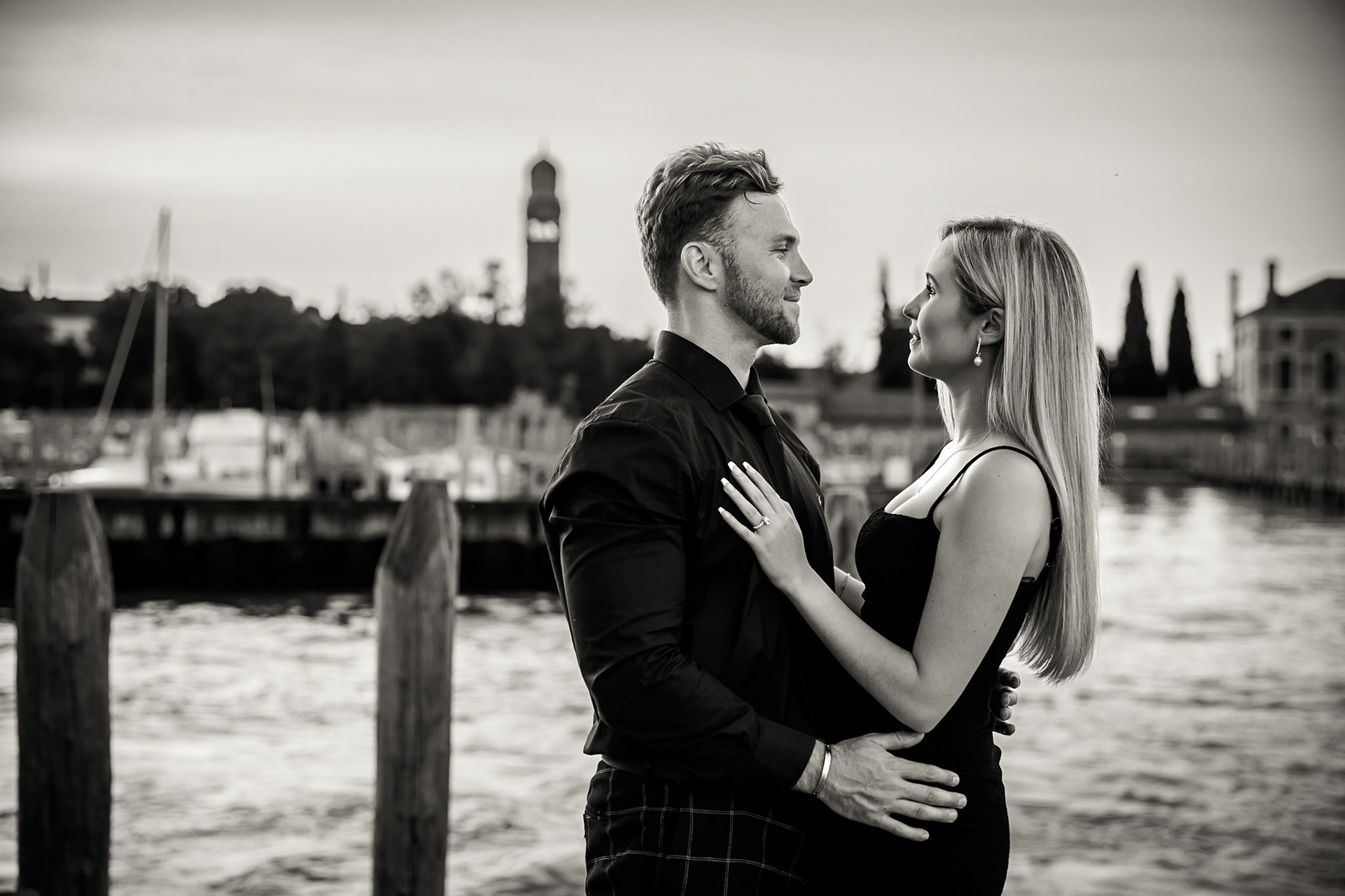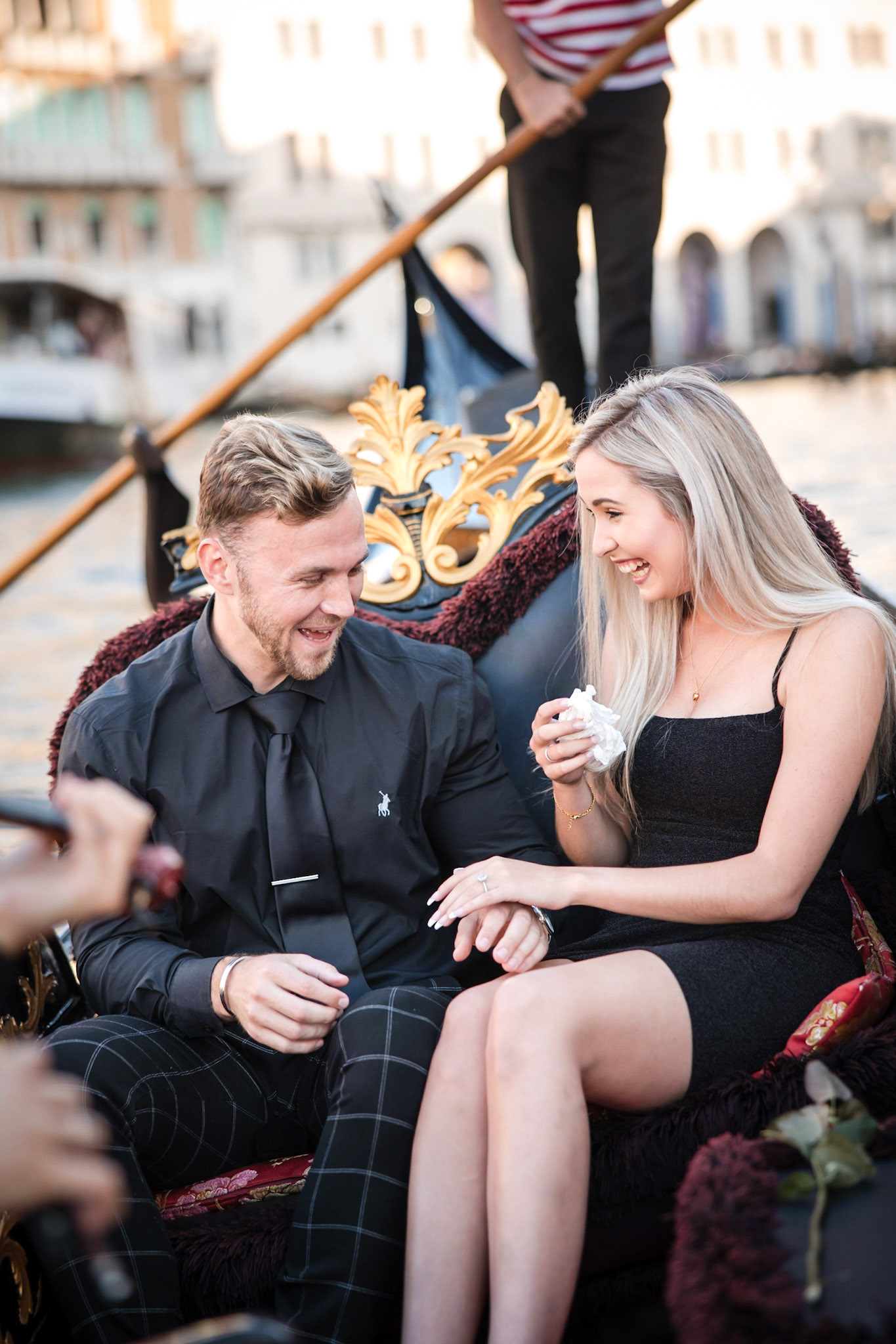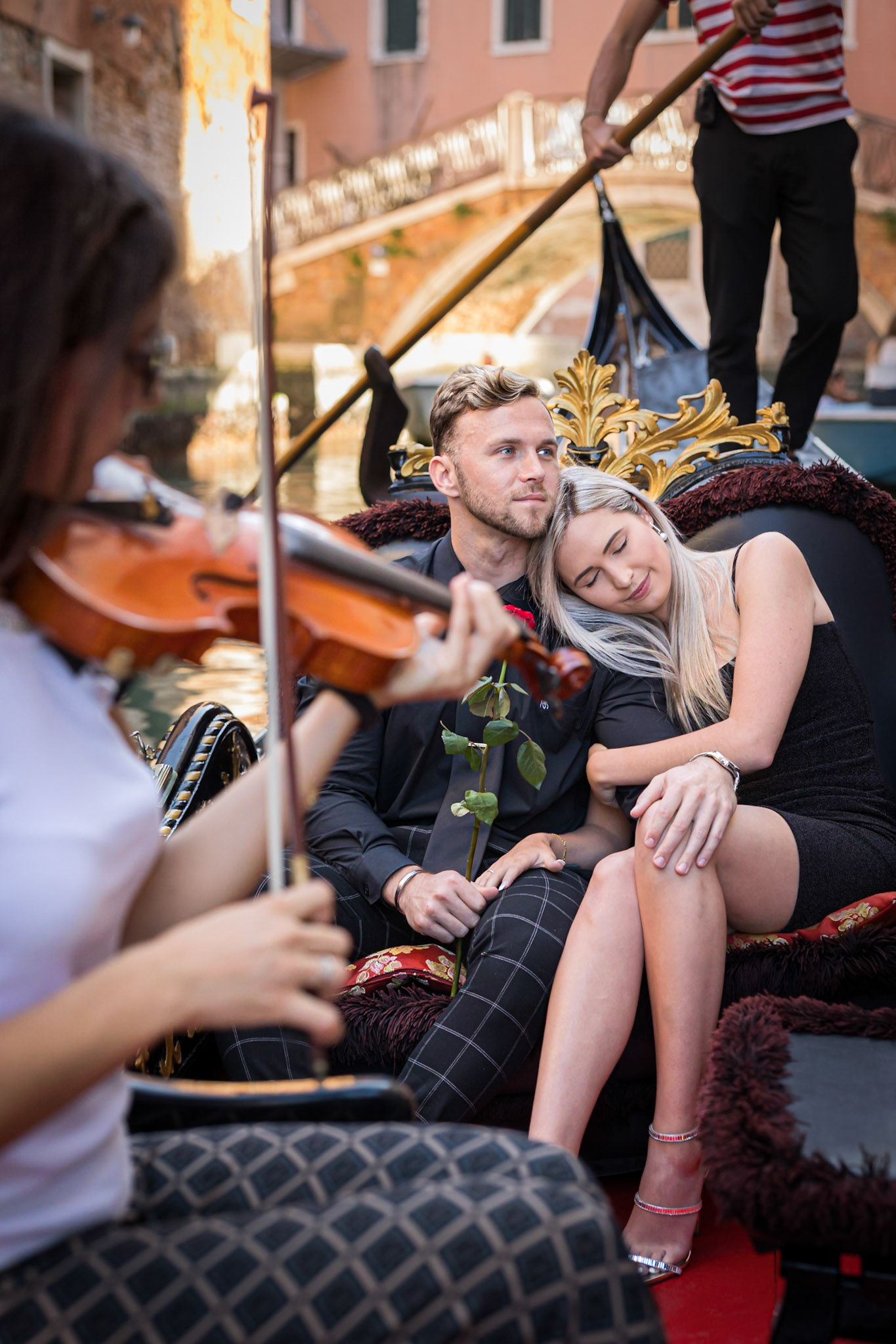 It started as a gondola tour on Grand Canal in Venice. The presence of a violinist hinted that it was a special occasion, soon after departure we crossed Rialto bridge and the proposal has been made. Once back to hotel Ca' Sagredo a short but intense engagement session with sunset light and we ended the photosession with a walk in Venice.