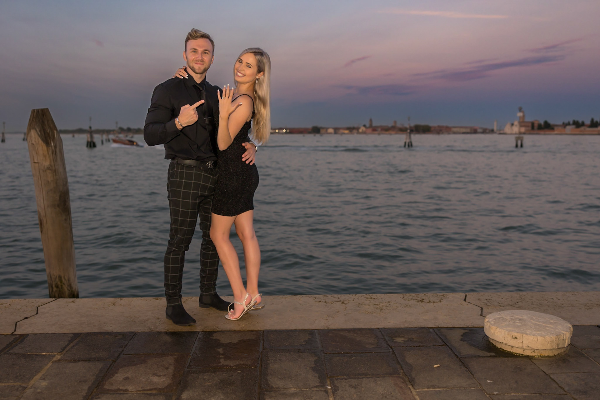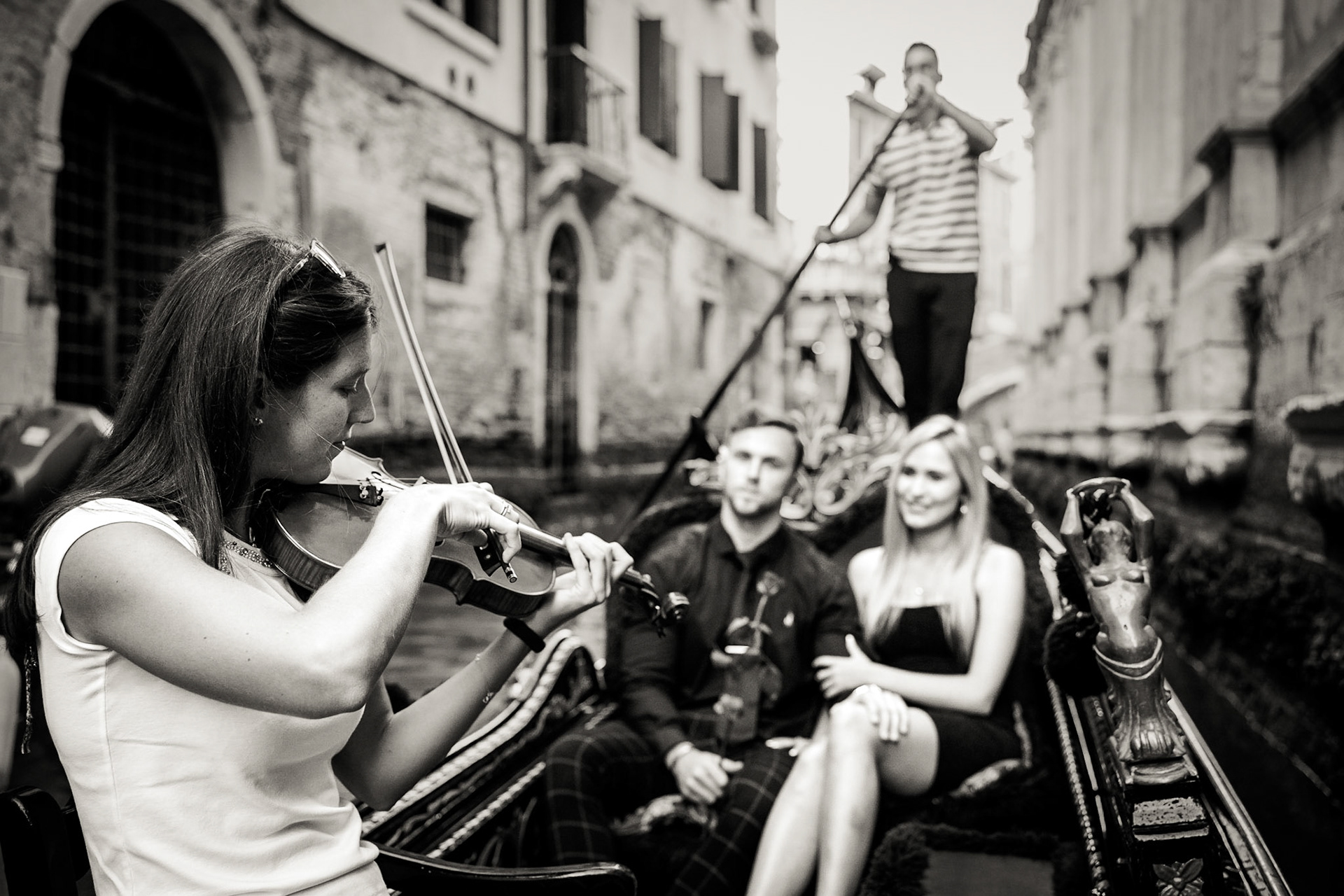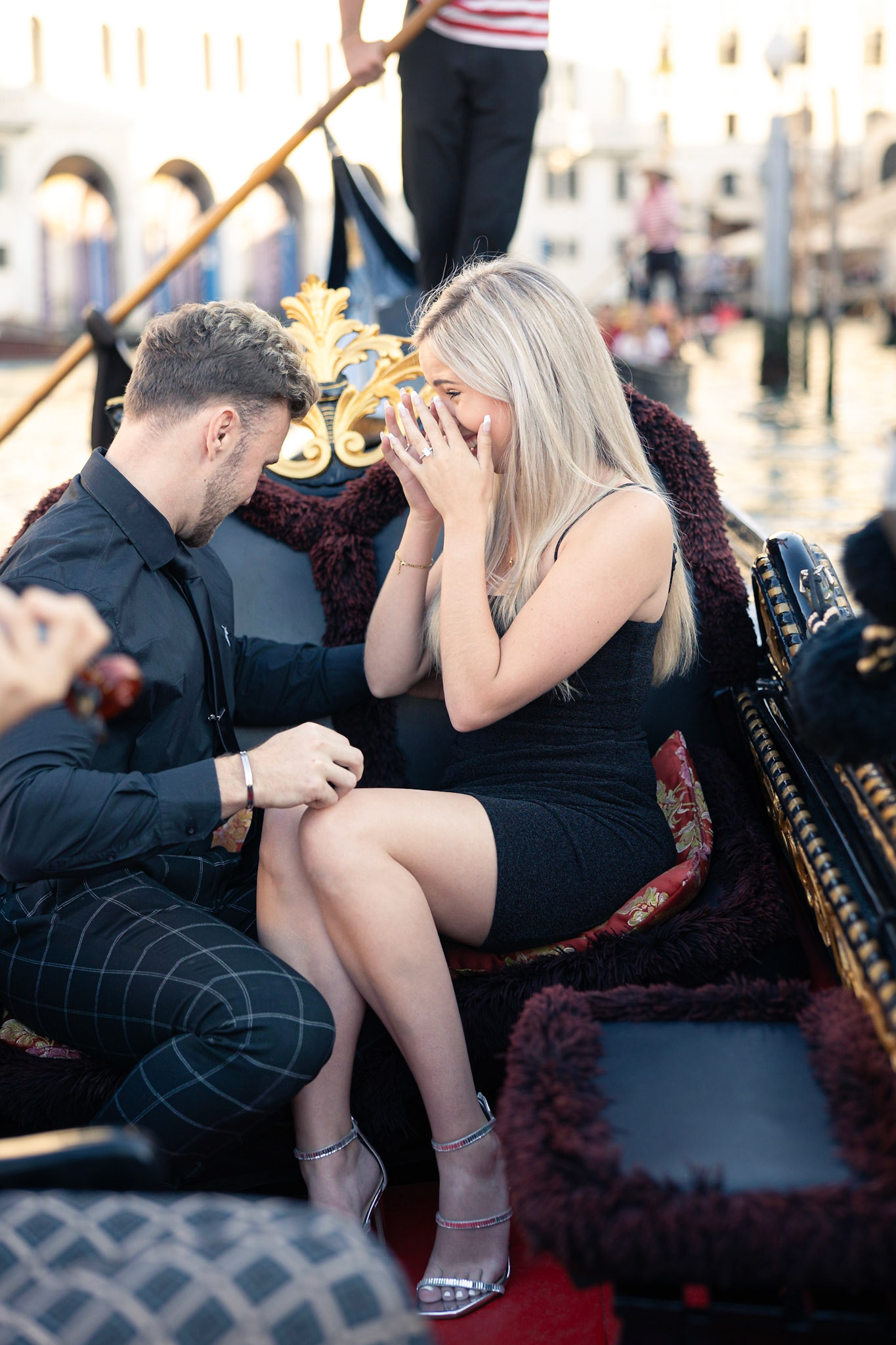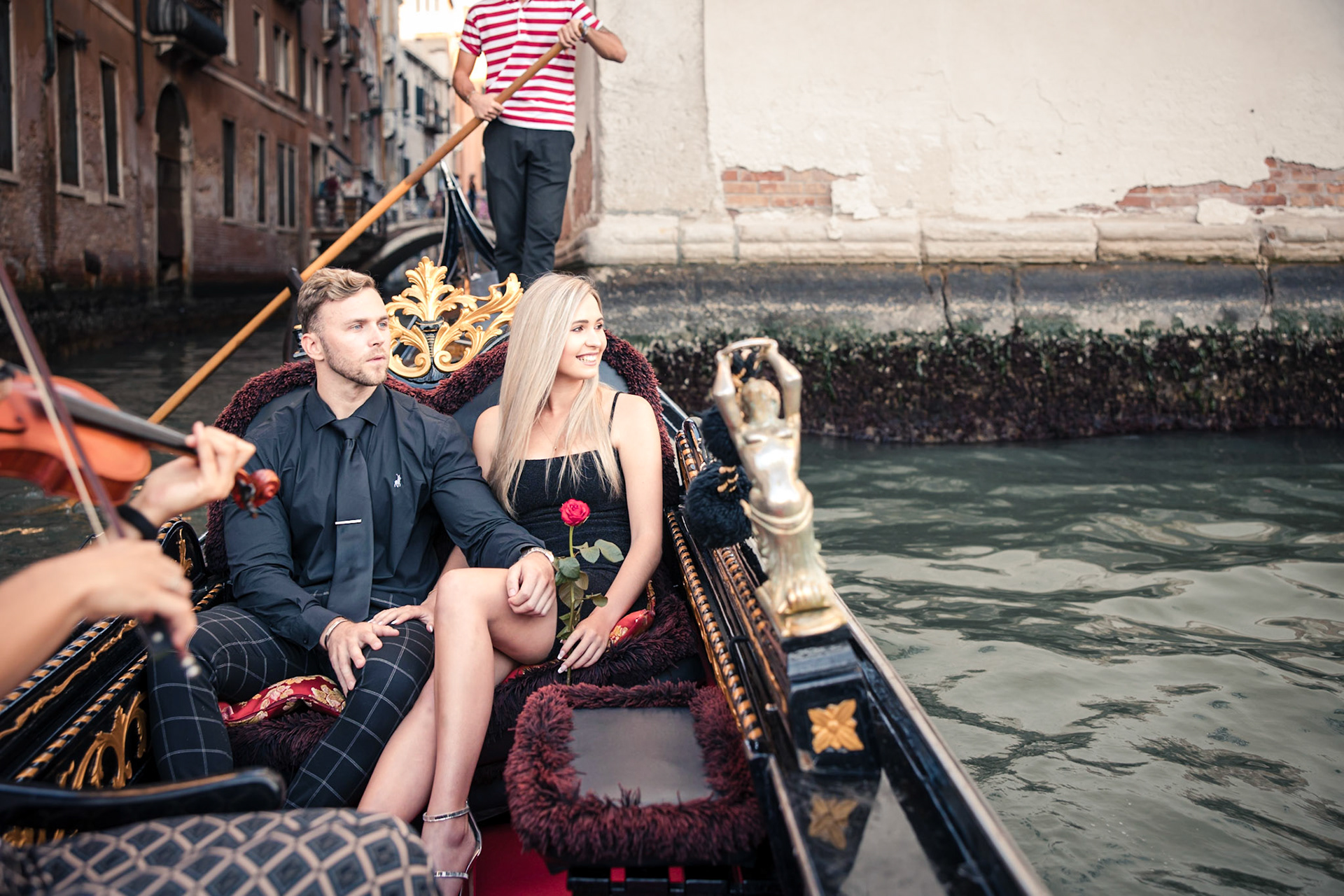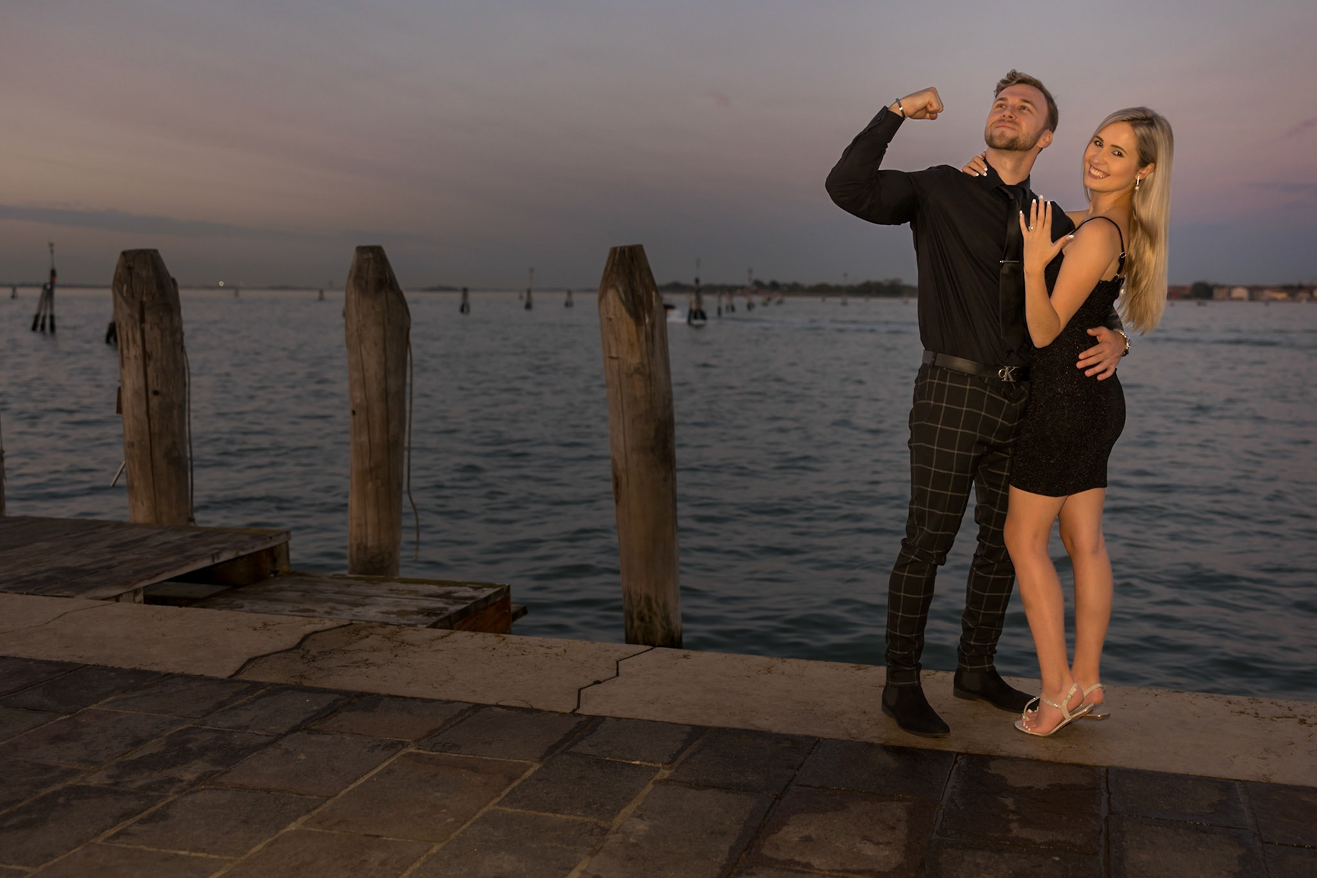 It started as a gondola tour on Grand Canal in Venice. The presence of a violinist hinted that it was a special occasion, soon after departure we crossed Rialto bridge and the proposal has been made. Once back to hotel Ca' Sagredo a short but intense engagement session with sunset light and we ended the photosession with a walk in Venice.